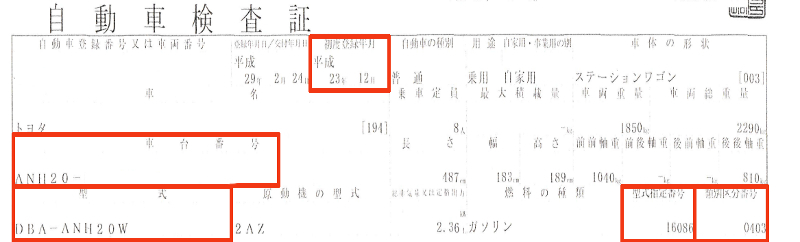 車検証の記載項目から割り出しますので、お電話からのお問合わせの際には、必ずお手元にご用意して、赤枠の項目をお伝えください。